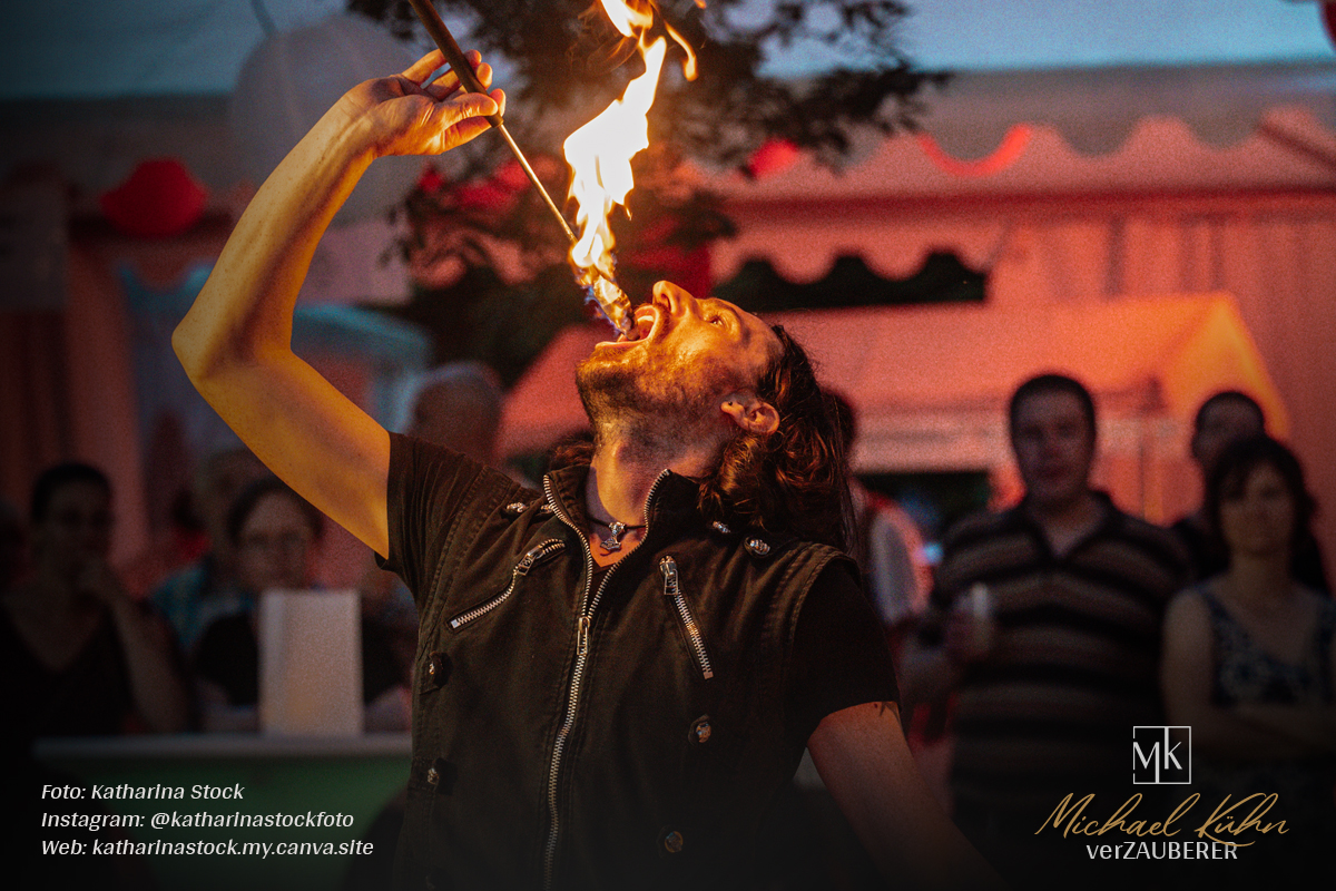 Den eigenständigen Programmpunkt „Flammenspiel & Lichterzauber“ können Sie als Ergänzung zu einem meiner Hauptprogramme buchen – noch mehr Action mit selbstleuchtenden oder brennenden Utensilien wie Bälle, Stäbe und Ketten, sowie klassische Feuershow-Elemente wie das Feuerschlucken & Feuerspucken… Doch auch in dieser Show kommen spannende Interaktionen mit dem Publikum nicht zu kurz. Eine kleine Ergänzungs-Show für den Außenbereich nach Einbruch der Dunkelheit zu treibender Musik. Die perfekte Sommer-Abend-Show!