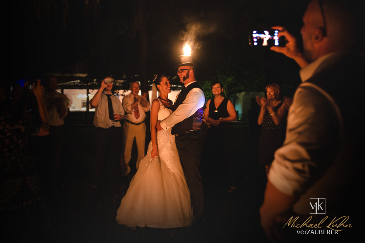 Und was, wenn Sie einfach mal selbst ausprobieren wollen, wie es sich anfühlt, Feuer zu spucken? Das geht! Mit meinem kleinen Feuer-Workshop für private Feiern oder Team-Events. Feuer spucken, Feuer auf der Haut spüren, brennende Fackeln werfen (und im besten Fall sogar wieder fangen…), den brennenden Hut für ein Erinnerungsfoto aufsetzen. All das in ungezwungener Atmosphäre im Freien auf Ihrer nächsten Veranstaltung! Was ich auf jeden Fall garantieren kann: Für außergewöhnliche Fotos und Erfahrungen wird ausreichend gesorgt sein.